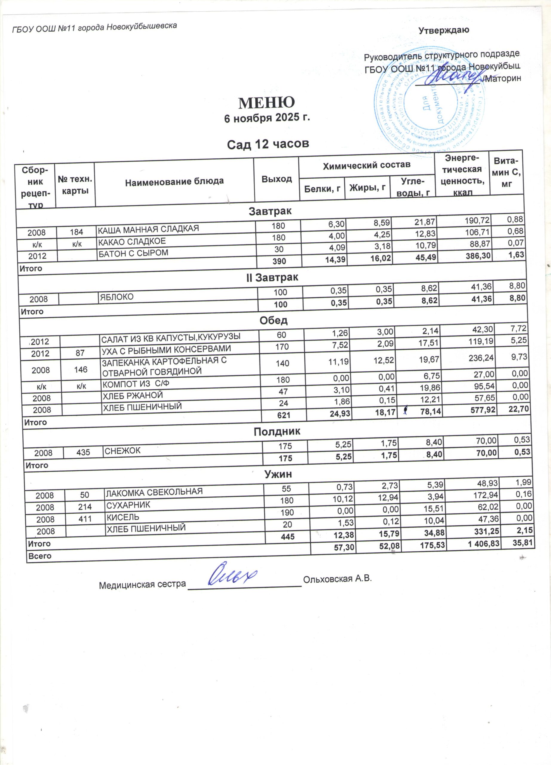 • Утвержденное ежедневное меню