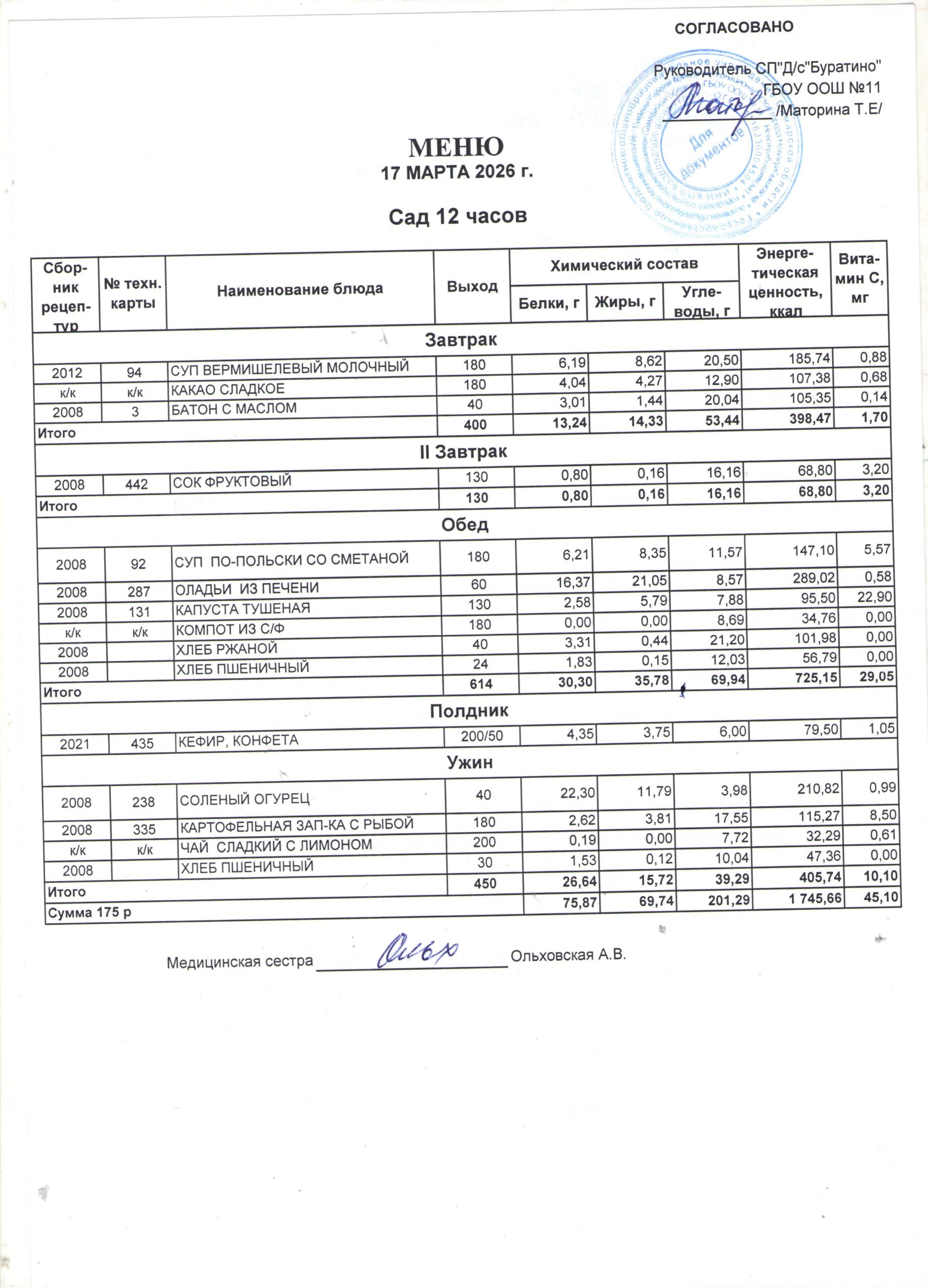 • Утвержденное ежедневное меню